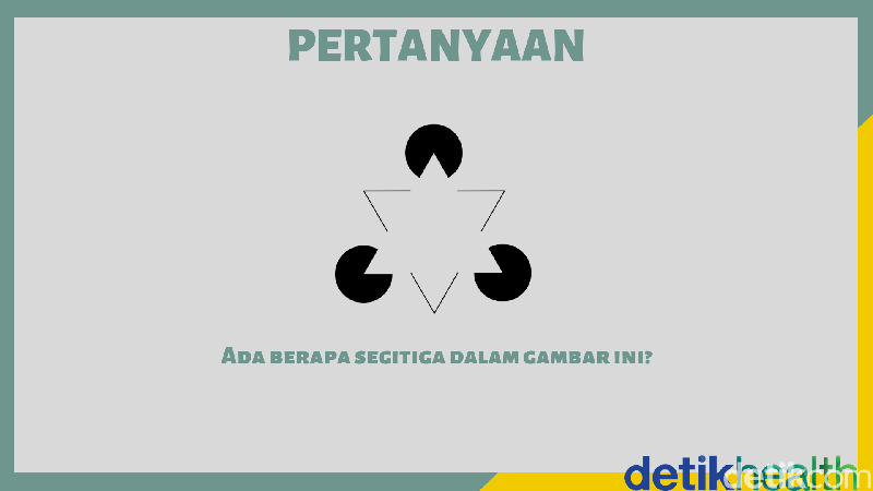 Tebak-tebakan Ilusi Optik, Bisakah Kamu Pecahkan Jawabannya? BAGIKAN URL telah disalin Ada berapa segitiga yang bisa kamu temukan dalam gambar? (Foto: detikHealth) Segitiga yang kamu lihat karena ilusi kontur ini sering disebut "segitiga kanizsa". (Foto: detikHealth) Coba hitung ujung atas dan bawah balok apakah jumlahnya sama. (Foto: detikHealth) Lingkaran merah menunjukkan di mana ujung garis mulai melebur sehingga jumlah balok seolah tidak sama. (Foto: detikHealth) Harusnya kamu bisa melihat dua gambar. (Foto: detikHealth) Tidak bisa perhatikan wajah orangnya? Perhatikan siluet yang dibentuk oleh gambar vas. (Foto: detikHealth) Apakah titik hitam di sebelah kiri? (Foto: detikHealth) Ilusi ini disebut efek Delboeuf. Mata kita akan melihat titik yang dikelilingi lingkaran kecil tampak lebih besar. (Foto: detikHealth) Pertanyaannya hampir sama. Kali ini kira-kira mana yang garisnya lebih panjang? (Foto: detikHealth) Kalau garis B tampak lebih panjang, jawabannya memang karena B lebih panjang. Ini pertanyaan jebakan. (Foto: detikHealth)