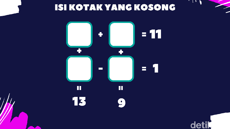 Teka-teki Ini Bisa Jadi Asupan Segar untuk Mengasah Kecerdasan Otak BAGIKAN URL telah disalin Kira-kira angka apa saja yang perlu mengisi kotak? (Foto: detikHealth) Atau ada yang bisa menemukan kombinasi angka lain? (Foto: detikHealth) Kamu harus tebak dulu pola yang ada di barisan ini. (Foto: detikHealth) Urutan polanya -1, +5, -2, +10, -4, +20. (Foto: detikHealth) Hati-hati urutan pengerjaannya. (Foto: detikHealth) Kalau enggak yakin coba cek pakai kalkulator. (Foto: detikHealth) Tebak dulu berapa nilai lebah dan semutnya. (Foto: detikHealth) Lebah bernilai 9 sementara semut bernilai 1. (Foto: detikHealth)