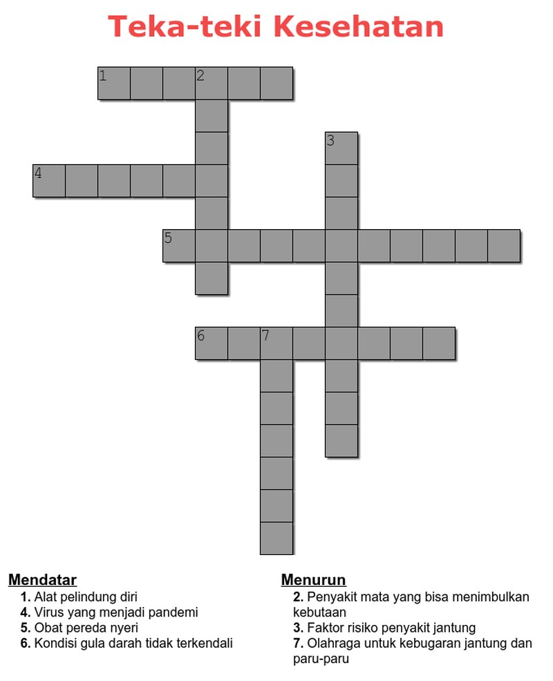 Teka-teki Silang Seputar Kesehatan, Seberapa Luas Pengetahuan Kamu? BAGIKAN URL telah disalin Supaya terukur, perhatikan waktu pada jam terdekat sebelum mulai mengerjakan teka-teki. Bagaimana? Bisa terjawab semua dalam waktu singkat?