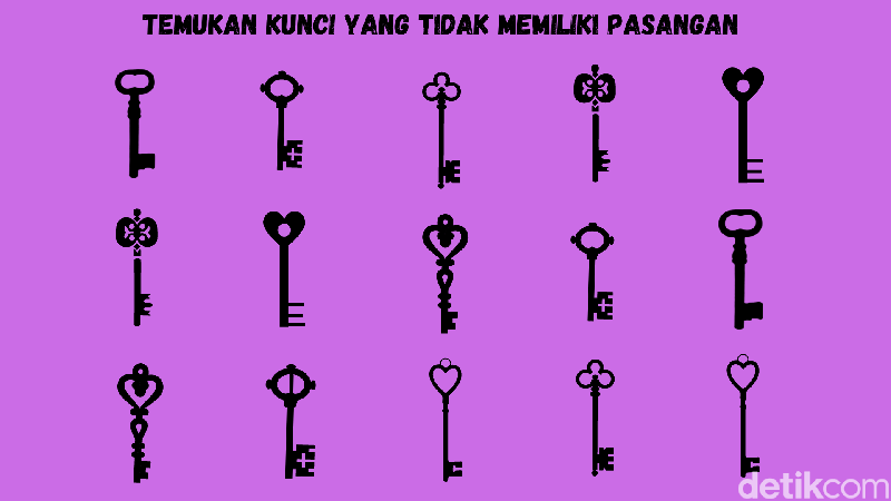 Cek Fokus dengan Tebak-tebakan! Benar Semua Berarti Masih Otak Masih Bugar BAGIKAN URL telah disalin Salah satu kunci tidak memiliki pasangan, coba temukan! Hanya kunci tersebut yang tidak memiliki pasangan. Kira-kira ada berapa jumlah kucing seluruhnya, ya? Ternyata masih ada dua kucing kecil yang bersembunyi di antara kucing besar.