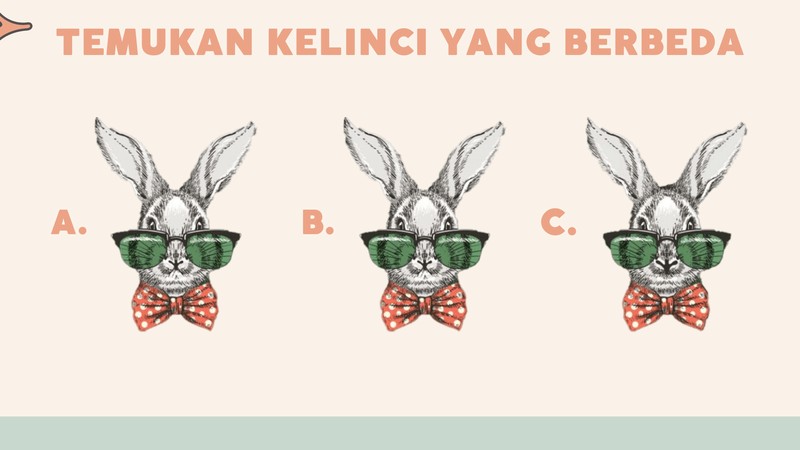 Seberapa Tajam Mata Kamu Memperhatikan Detail? Coba Jawab Teka-teki Ini BAGIKAN URL telah disalin Perbedaan yang ada mungkin kecil, tapi tetap membuatnya berbeda. Bentuk hidung sang kelinci C berbeda sendiri. Masih sama seperti sebelumnya. Cari satu hal yang membuat satu gambar berbeda dari gambar lain. Kucing B memiliki baju dengan kantung. Tidak perlu menjawab cepat-cepat. Coba cari lebih teliti. Burung D berbeda sendiri karena bulu lehernya tidak bergelombang.