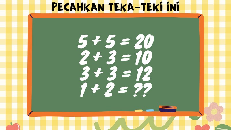 Tebak-tebakan Buat Si Genius, Apakah Kamu Termasuk? Coba Buktikan BAGIKAN URL telah disalin Sebagian besar teka-teki ini mengharuskan kamu menebak pola yang ada di tiap angka. Petunjuknya adalah hasil penjumlahan angka di kiri dikalikan dua. Buktikan kamu bisa berpikir logis sekaligus kreatif. Pindahkan korek dari tanda '+' untuk mengubah '5' jadi '6'. Teka-teki terakhir nih. Sering keluar saat tes psikologi. Kuncinya adalah mulai dari kiri angka dikali dua, tiga, dan seterusnya sampai yang terakhir dikali lima.
