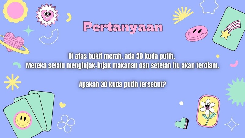 Jangan Ngaku Cerdas Kalau Tak Bisa Jawab Semua Tebak-tebakan Receh Ini BAGIKAN URL telah disalin Kira-kira kuda apa ya? Ternyata jawabannya gigi, receh kan? Nah, masih tebak-tebakan receh nih. Jawabannya apa tuh? Nah, kalau di peta ada gedung dan sungai beneran, gede banget dong xixixi... Si anak kelima ngapain ya? Coba dibaca dengan teliti. Yap, si anak kelima nemenin Yati main catur. Masa main sendirian sih?