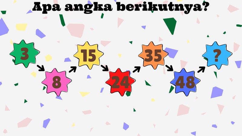 Latih Otak Makin 'Encer' dengan Teka-teki Ini, Bisakah Kamu Jawab Semua? BAGIKAN URL telah disalin Perhatikan urutan angka dari kiri ke kanan. Kuncinya adalah angka bertambah lima mulai dari paling kiri, lalu bertambah 7, 9, 11, 13, dan terakhir 15. Ada pola hubungan antara angka di bagian atas dan bawah. Angka di bagian bawah merupakan hasil perkalian angka di atas dan tengah. Sementara angka di atas merupakan hasil pembagian angka di bawah dan tengah. Teka-teki terakhir. Lebih sulit dari yang sebelumnya. Pola di sini adalah hasil penjumlahan dari dua angka yang ada dikalikan lagi dengan angka pertama untuk mendapat hasil akhir.