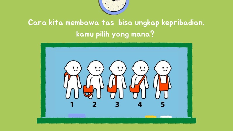 Cara Kamu Memakai Tas Bisa Menunjukkan Kepribadian, Kamu yang Mana? BAGIKAN URL telah disalin Pilih gambar yang menunjukkan pemakaian tas kamu sehari-hari, dan cari tahu jawabannya di slide berikutnya. Kamu orang yang siap untuk berpergian. Selain itu, kamu juga selalu bisa diandalkan. Jadi, apakah kamu memang suka membaca buku? Namun, kelemahan bisa kamu tutup dengan kelebihan yang kamu miliki. Apa tipe kepribadianmu? Share di kolom komentar ya!