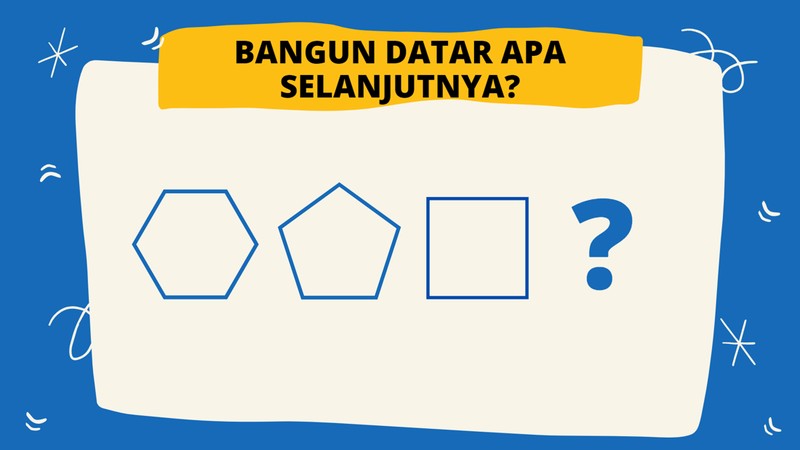 Ngantuk Berat Sehabis Bukber? Bikin Melek dengan Teka Teki Ini BAGIKAN URL telah disalin Menurut kamu apa bentuk bangun datar yang keempat? Segiempat jika dikurangi satu sisinya akan berbentuk segitiga. Cluenya adalah sesuatu yang selalu ini kamu pendam. Rahasia apabila diberi tahu ke orang lain artinya bukan rahasia lagi. Kira-kira mengapa Roy dan Nino bisa menang dengan seri yang sama? Mereka bermain dengan orang lain. Jadi, berapa banyak teka-teki yang bisa kamu jawab?