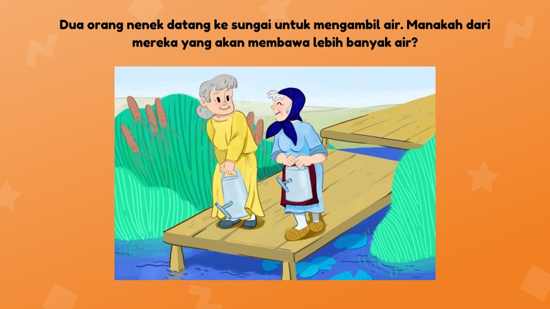 Kira-kira nenek berbaju biru atau nenek berbaju kuning yang akan membawa air lebih banyak?