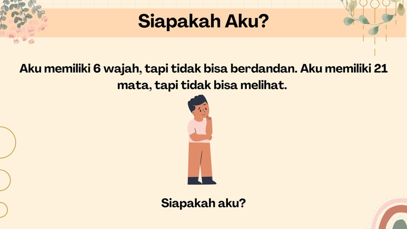 Aku Siapa Sih? Teka-teki Mudah Ini Harusnya Nggak Bikin Otak 'Ngebul' BAGIKAN URL telah disalin Yakin bisa jawab soal ini dalam 5 detik? Apakah jawaban kamu sudah benar? Hmm.. kira-kira aku apa ya? Masih cukup mudah? geser untuk pertanyaan terakhir. Harusnya semua orang tahu siapa aku. Coba tulis di kolom komentar kamu bisa jawab berapa soal?