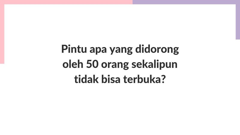 Tebak-tebakan Buat Lemesin Otak, 'Sepaneng' Terus Bikin Cepat Botak BAGIKAN URL telah disalin Kira-kira apa ya jawabannya? Katanya sih 90 persen orang nggak bisa jawab. Foto: Salsa Dila Fitria Oktavianti/detikHealth Wah, ada nggak nih yang punya pengalaman serupa, dorong pintu yang kebukanya kalau digeser. Foto: Salsa Dila Fitria Oktavianti/detikHealth Hewan apa ya? Jangan sampai salah. Foto: Salsa Dila Fitria Oktavianti/detikHealth Oalah ternyata burung terbang bersamaan. Foto: Salsa Dila Fitria Oktavianti/detikHealth Berapa ya sisa lilin Fahri sekarang? Foto: Salsa Dila Fitria Oktavianti/detikHealth Coba tebak di komentar yuk. Bener semua absen ya. Foto: Salsa Dila Fitria Oktavianti/detikHealth