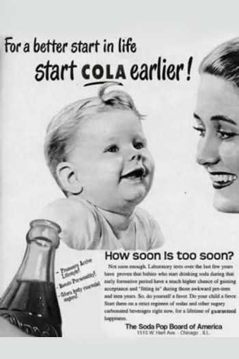 Iklan di tahun 1950 mencoba menarik perhatian orangtua untuk memberikan minuman bersoda untuk anak. Lebih parah lagi, di dalam poster dituliskan 'For a better start in life, start Cola earlier', yang artinya meminta orangtua untuk memberikan Cola sedini mungkin agar anak-anak memiliki kualitas hidup yang lebih baik.