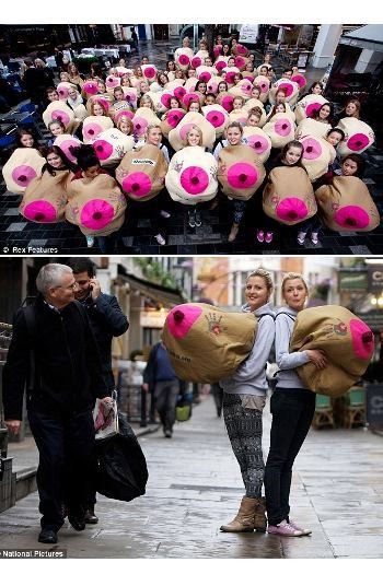 Dengan gesit dan lincah, 100 sukarelawan wanita berkumpul di pusat kota London untuk mengambil bagian dalam 'Flashmob' raksasa, sebuah koreografi tari secara tiba-tiba yang ditujukan untuk mengejutkan orang yang lewat. Yang menarik, semua wanita muda tersebut berpakaian sebagai payudara besar.