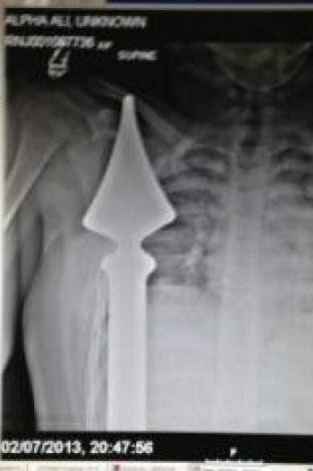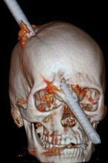 Tombak menghujam tepat di atas mata kirinya dan mendesak otak. Beruntung tombak tidak mengenai titik vital dan dokter bedah dapat mengambil tombak tanpa merusak otak di kepalanya.