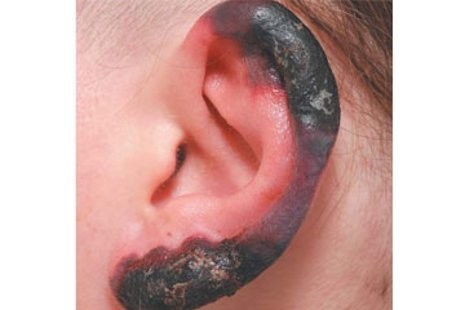 Kondisi ini terjadi pada hidung, telinga dan kedua kakinya. Kulit ketiga organ itu pun berubah warna menjadi hitam karena kerusakan jaringan kulit yang telah berlangsung selama beberapa hari.