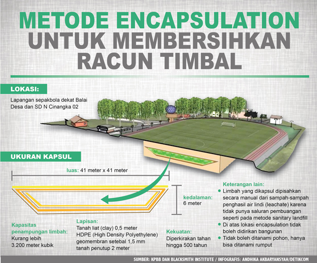 Proyek encapsulation dimulai dengan menggali lubang sedalam 6 meter dengan luas 41 meter x 41 meter di sebuah lapangan sepak bola, persis di sebelah SD N Cinangka 02. Lokasi ini dipilih karena menjadi tempat bermain anak-anak dan dinilai paling memungkinkan terjadinya kontak dengan racun timbal (Pb).