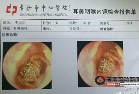 Dokter mengira ia mengalami infeksi telinga, tetapi kemudian seorang spesialis menemukan bahwa ada belatung pemakan daging yang bersarang di dalam lubang telinga Harris. Pemeriksaan menunjukkan bahwa gendang telinga, pembuluh darah, dan saraf wajah wanita itu tidak dirusak oleh belatung. Tetapi si belatung telah membuat lubang sepanjang 12 milimeter di telinga Harris.