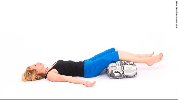 Letakkan bantal di bagian bawah lutut. Tutup mata dan tarik napas perlahan lewat hidung. Penuhi bagian bawah paru-paru Anda dengan udara dan Anda akan merasa tulang rusuk seperti mengembang ke luar.