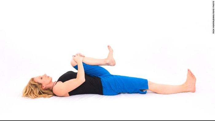 Tarik napas bersamaan dengan lutut menyentuh dada. Ulangi gerakan ini dengan menggunakan kaki sebelah kiri. Selain melancarkan peredaran darah, gerakan ini juga membuat saluran napas Anda terbuka lebih lebar.