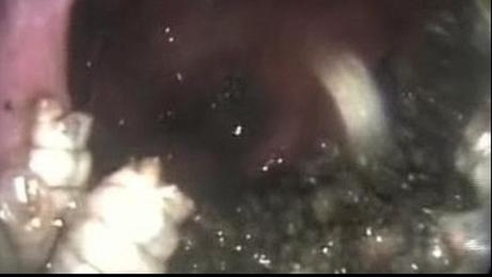 Namun setelah berhasil dikeluarkan, ternyata itu bukanlah dahak, melainkan larva serangga sepanjang lima milimeter. Larva yang berbentuk mirip belatung itu diduga larva dari mayfly atau lalat capung dan masih hidup.