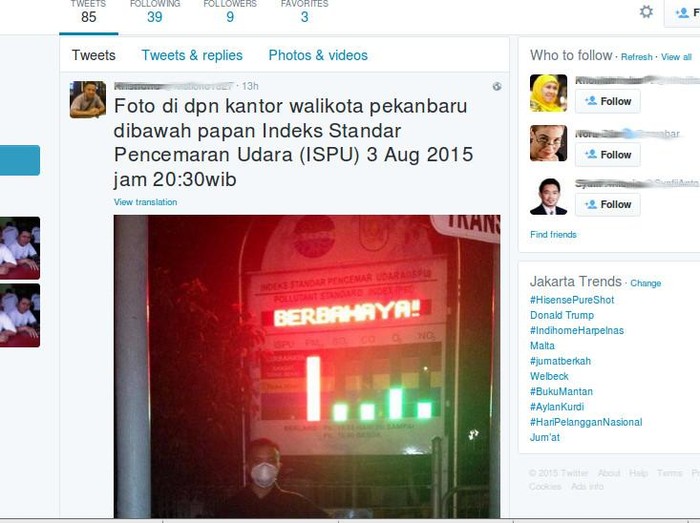 Sejak Kamis (3/9) malam, ISPU (Indeks Standar Polusi Udara) di Pekanbaru menunjukkan level 'Berbahaya'. Menurut laporan salah seorang pembaca detikcom di Pekanbaru, banyak warga yang mengabadikan peringatan tersebut, bahkan ada juga ber-selfie ria dengan papan indeks tersebut.