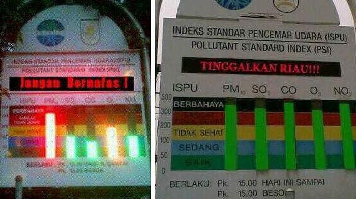 Rupanya meme ini dibuat untuk memperlihatkan betapa parahnya kondisi kabut di Sumatera, terutama di Riau. Saking pekatnya sampai-sampai papan ISPU (Indeks Standar Polusi Udara) tak lagi menunjukkan level 'Berbahaya', melainkan 'Jangan Bernapas'.
