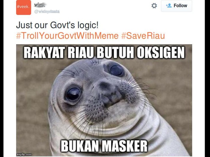 Di samping gambar singa laut, meme ini juga bertuliskan 'Rakyat Riau Butuh Oksigen, Bukan Masker'. Meskipun kondisi udara di kota Pekanbaru sudah tergolong ke dalam level 'Berbahaya', namun sejauh ini upaya yang dilakukan pemerintah setempat untuk menanggulanginya hanyalah membagikan masker kepada masyarakat.