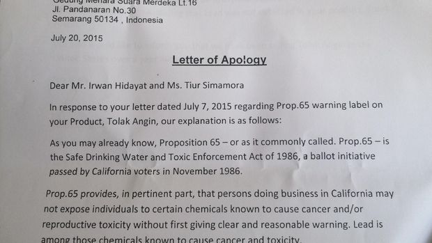 "At that time we did not realize that this could cause such damage to your brand in Indonesia," tulis Sunarto Ruski, Vice President Empire International yang merupakan distributor Tolak Angin di Amerika Serikat, dalam letter of apology yang ditujukan untuk PT Sido Muncul.