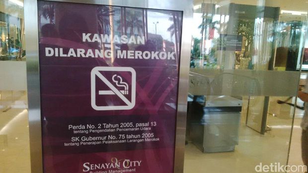Dari pengamatan detikHealth, hampir semua mal atau pusat perbelanjaan di Jakarta sudah memasang poster dan spanduk larangan merokok, bahkan beberapa di antaranya di tiap lantai. Rata-rata spanduk tersebut berisi tulisan 'Kawasan Dilarang Merokok' dan peraturan yang mendasarinya yakni Pergub DKI No 50/2012 dan Perda No 2/2005.