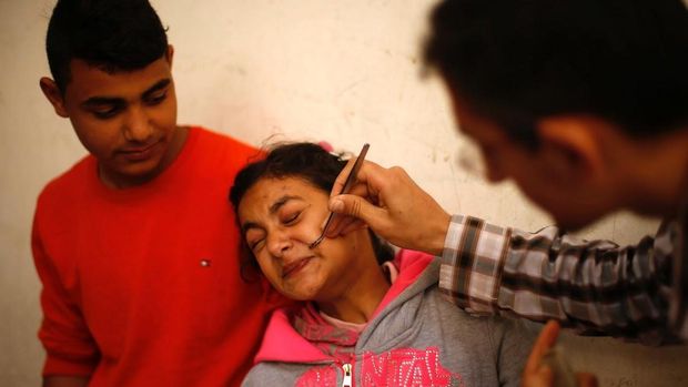 Tampak di foto, bocah pengidap alopecia areata, kelainan kulit yang membuat tubuhnya tidak memiliki rambut, sedang mengantre untuk mendapat pengobatan. (Foto: REUTERS/Suhaib Salem) |