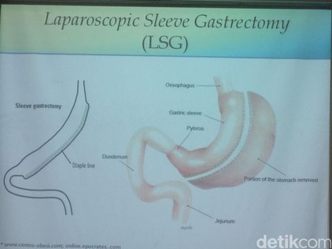 "Pada LSG, lambung kita potong seperti bentuk tangan panjang dengan teknik laparoskopi. Kemudian, sisa lambung yang sudah dipotong kita jepret dengan staples yang terbuat dari titanium. Sisa potongan lambung kurang lebih 75 persen dibuang," tuturnya.