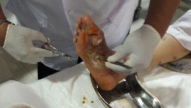 Dalam foto terlihat telapak kaki seorang jemaah wanita memang nampak melepuh dan berwarna kemerahan seperti terbakar. Tindakan dilakukan petugas untuk mengeringkan luka lepuh dan mempercepat penutupan luka agar jemaah bisa kembali beribadah.