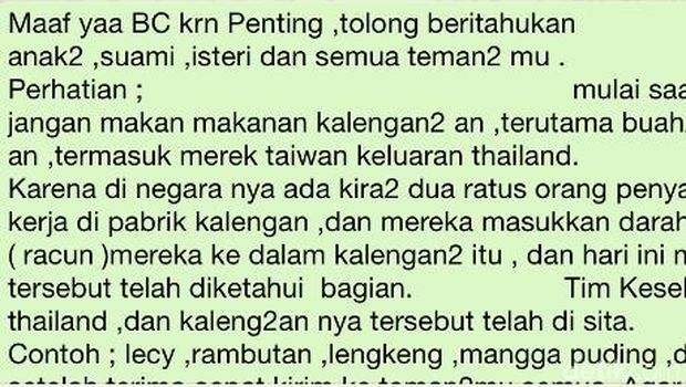 Ya, beberapa broadcast melalui BlackBerry Messenger (BBM), WhatsApp, maupun melalui media sosial antara lain menyebut untuk berhati-hari dengan makanan atau minuman kalengan yang diimpor dari negara tertentu. Sebab para pekerja positif HIV-AIDS tempat makanan itu dibuat memasukkan darah mereka ke dalam kemasan makanan tersebut.