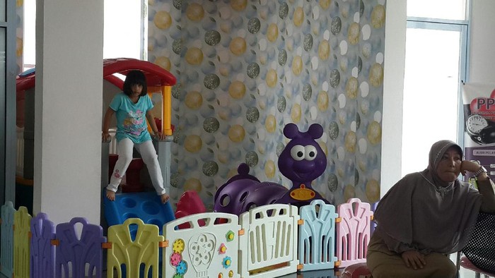 Masuk ke bagian dalam puskesmas ini, warna gelap masih menghiasi dindingnya. Warna wall paper motif bunga-bunga gelap menjadikan ruangan terasak sejuk. Sementara di sudut kanan ruangan ada tempat bermain anak-anak.