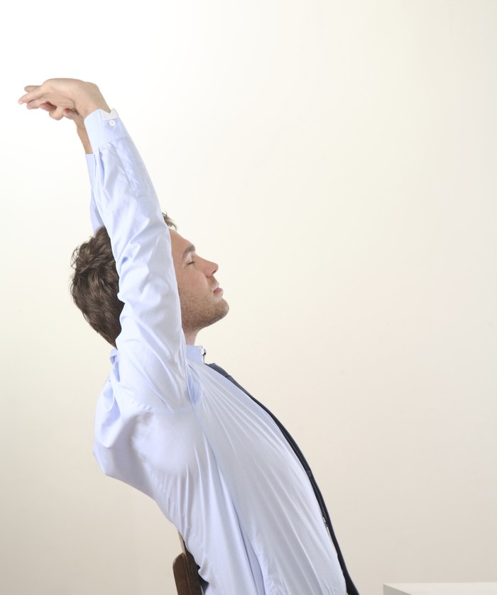 Jika duduk dalam waktu yang cukup lama, pinggul dan badan akan terkunci dalam satu posisi yang menyebabkan kekakuan. Untuk itu, lakukan peregangan yang singkat selama 30 detik.Peregangan juga berfungsi untuk meredakan otot yang tegang jika duduk berlama-lama. Caranya gampang, angkat lengan kiri ke atas dan tahan diatas kepala kemudian condongkan badan ke kanan. Tahan selama 30 detik lalu ulangi pada sisi berlawanan.