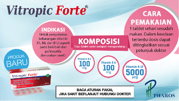 Untuk itu kita, bisa mengonsumsi Vitropic Forte, dengan kandungan vitamin B1 100 mg, B6 100 mg, dan B12 5000 μcg. Dengan mengonsumsinya, Anda dapat memenuhi kebutuhan vitamin B1, B6 dan juga B12 yang juga akan mencegah Anda dari kerusakan pada beberapa bagian saraf, juga penyakit lain seperti beri - beri.