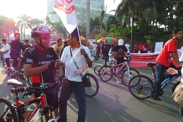 Jakarta - Di sela-sela Car Free Day (CFD) di Jl MH Thamrin Jakarta Pusat, sekitar 20 dokter berorasi dan membagikan pin berisi pesan-pesan kesehatan. Kegiatan ini dilakukan dalam rangka Hari Bhakti Dokter Indonesia yang diperingati tiap 20 Mei.