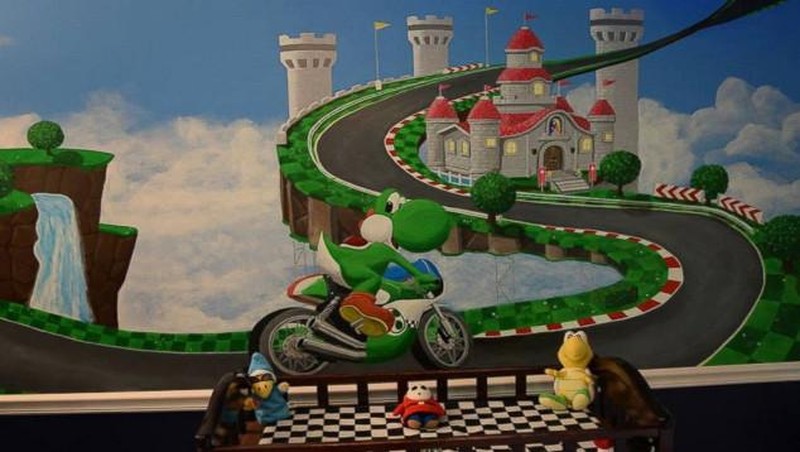 Ayah dua anak itu sengaja memilih tema Mario Kart 8 keluaran 2014 karena kecintaannya pada Nintendo. Kamar itu dilengkapi dengan mobil-mobilan yang dapat mengeluarkan lagu pengiring video game Mario Kart, dekorasi bertemakan Mario Kart, bahkan lukisan mural dari karakter-karakter yang ada dalam game tersebut, di antaranya Mario, Luigi, Princess Peach, dan musuh mereka, Bowser. (Foto: Wes Swain/ABC News)