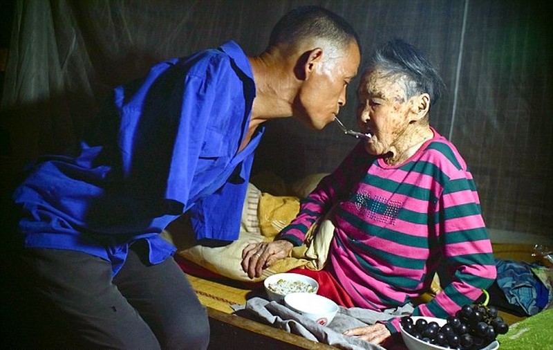 Satu bulan lalu, ibu Xinyin yang berusia 91 tahun mengalami kelumpuhan. Untuk merawat sang ibu seperti menyuapi pun, Xinyin harus mengandalkan tangan dan mulutnya. (Foto: Imaginechina/REX-Shutterstock)
