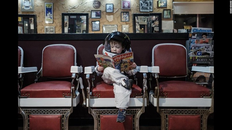 Aaron Sheldon mencoba mengabadikan momen saat Harrison mengeksplorasi lingkungannya dengan pakaian astronot. Dalam foto tampak bocah 3 tahun itu sedang membaca komik di suatu toko. Proyek foto Harrison dan ayahnya, Aaron, ini berjudul Small Steps Giant Leaps. (Foto: Aaron Sheldon/CNN)