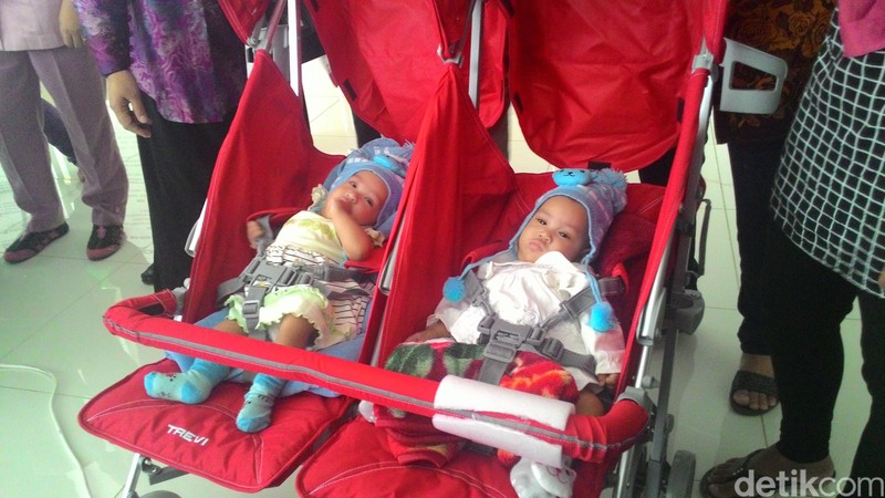 Saqira dan Safira merupakan bayi kembar siam di bagian perut. Setelah hampir 4 bulan mendapatkan perawatan di RSCM dan menjalani operasi pemisahan tubuh, hari ini Jumat (19/8/2016) keduanya dinyatakan pulih oleh tim dokter dan diperbolehkan pulang. (Foto: Ajeng/detikHealth)