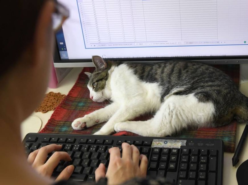Hidenobu Fukuda, direktur perusahaan tersebut, mengatakan adanya kucing yang lewat di atas komputer atau telepon memang kadang mengganggu pekerjaan. (Foto: Japan Times/AFP-JIJI)