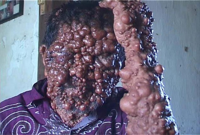 Penyakit tumor kulit parah dialami Chandra Wisnu, pria asal Malang ini sempat menjadi berita internasional. Ia hanya bisa pasrah dengan penyakit yang dialami, setelah berpikir gelembung di sekujur tubuhnya tak pernah terobati. Hanya dua hal yang dihindari bapak empat anak ini agar gejala diduga akibat kelainan genetik itu tak terus menyerang, yakni menghindari suhu panas serta berpikir berat.
