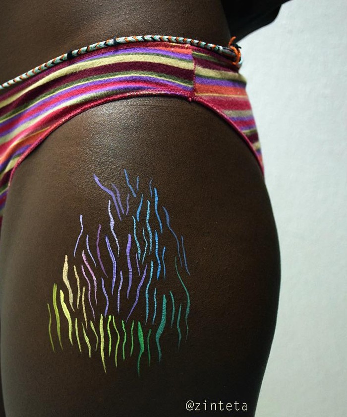 Dalam akun facebook dan instagramnya, ia melukis stretch mark yang ada di bagian paha dan bokong wanita dengan warna-warna cerah. Dengan mewarnai stretch mark menjadi menarik, diharapkan wanita tidak lagi malu jika memiliki stretch mark. (Foto: instagram/@zinteta)