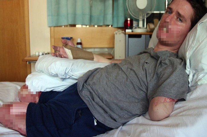 Alex Lewis, ayah satu anak asal Inggris, harus merelakan kedua kaki dan lengan kirinya diamputasi setelah kaki, jari, lengan, bibir, hidung, dan sebagian telinganya menghitam. Ia terinfeksi bakteri pemakan daging setelah hanya merasa demam dan flu biasa. (Foto: Facebook)