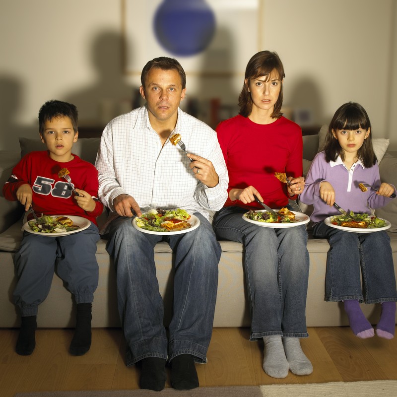 Menonton televisi saat makan bisa memunculkan risiko kegemukan. Maka itu matikan televisi dan nikmati makanan Anda supaya merasa lebih kenyang dan tak tergoda mengemil yang lain. (Foto: Thinkstock)