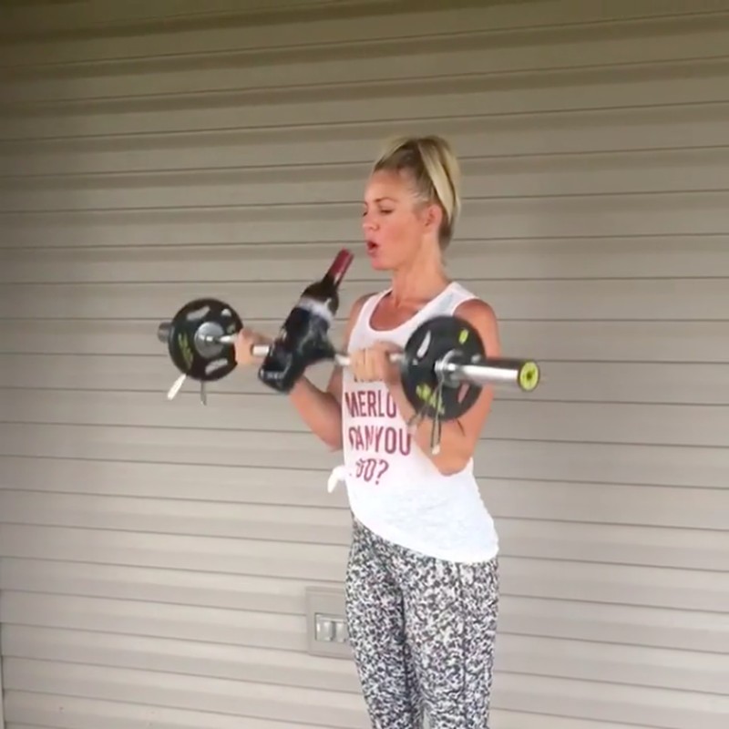 Melakukan squat jadi lebih menantang dengan botol wine berukuran besar sebagai pemberat. Foto: Instagram/radiomeg83