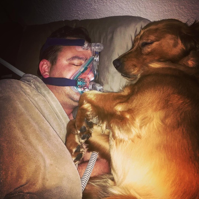 Momen yang sangat mengharukan, melihat pria yang mengidap sleep apnea diharuskan menggunakan sungkup CPAP (Continuous Positive Airway Pressure) ditemani dengan hewan peliharaannya. Terlihat anjinya itu sangat setia menemani tidur sang majikannya. (Foto: Instagram/justmegretchen)