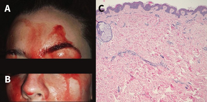 Dilaporkan dalam jurnal Canadian Medical Association Journal (CMAJ), seorang wanita 21 tahun dari Italia didokumentasikan mengeluarkan darah dari kulitnya. Pemeriksaan menunjukkan bahwa sel kulitnya normal dan cairan yang keluar memang betul darah bukan keringat berwarna. (Foto: Jurnal CMAJ)