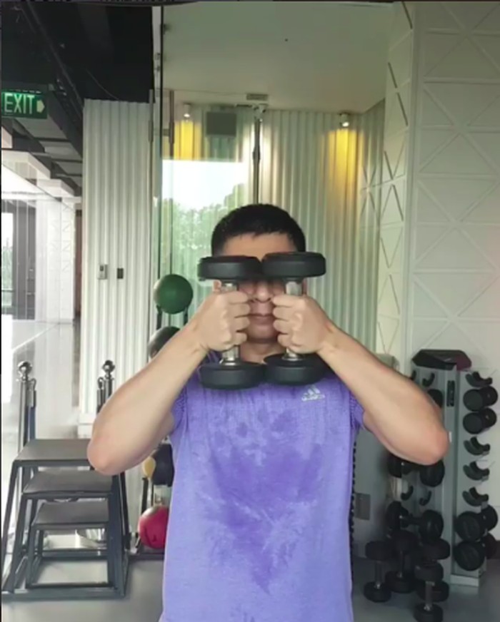Salah satunya video saat ia mengangkat barbell complex. Bukannya segera mengangkat, Raditya Dika malah menggoyangkan pinggulnya. "Bener gak sih makenya gini..," tulis Raditya Dika. Foto: Instagram @raditya_dika