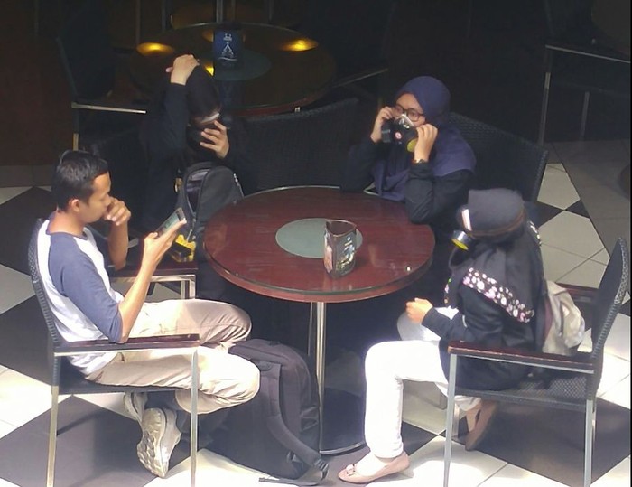 Mereka ingin menegur pelanggaran-pelanggaran soal kawasan tanpa rokok, dengan cara yang berbeda. Dengan menggunakan masker respirator, mereka mendatangi tenant-tenant yang pengunjungnya banyak merokok di dalam ruangan. (Foto: GEBRAK)