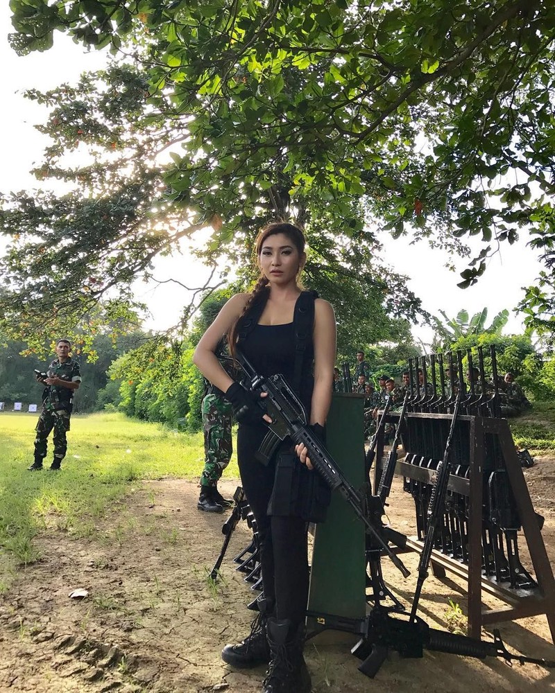 Di foto tersebut, tampak Baby bersama temannya tengah memperhatikan instruksi dari salah satu prajurit Kostrad. Foto: Instagram @babymargaretha1